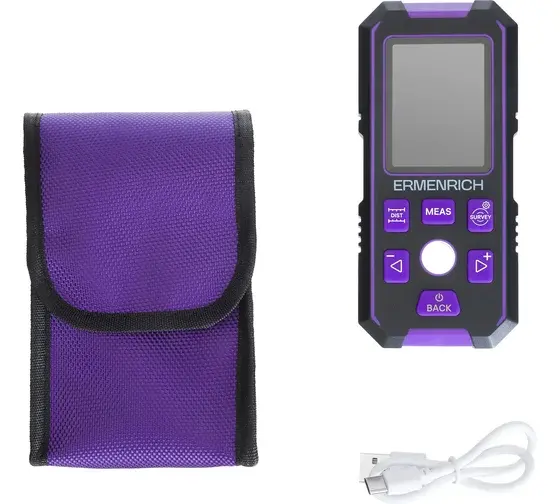 В детекторе Ermenrich Ping SM90 есть функция лазерной рулетки для измерения длины в диапазоне 0,2–40 м, доступно измерение в дюймах и футах. Предусмотрено два режима: единичное измерение или сканирование. Результаты замеров сохраняются во внутренней памяти детектора. По длине, ширине и высоте устройство автоматически вычисляет объем и площадь. С помощью функции «Пифагор» вычисляется длина стороны в прямоугольном треугольнике, например, для определения высоты объекта. Еще одна полезная функция – цифровой уровень для измерения углов от –90° до +90°.