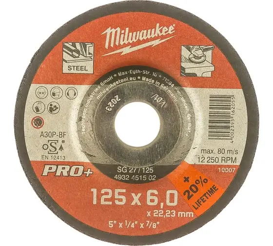 Шлифовальный диск по металлу SG 27/125х6 PRO+ Milwaukee 4932451502 лучше всего подходит для шлифования легированной и нелегированной стали.