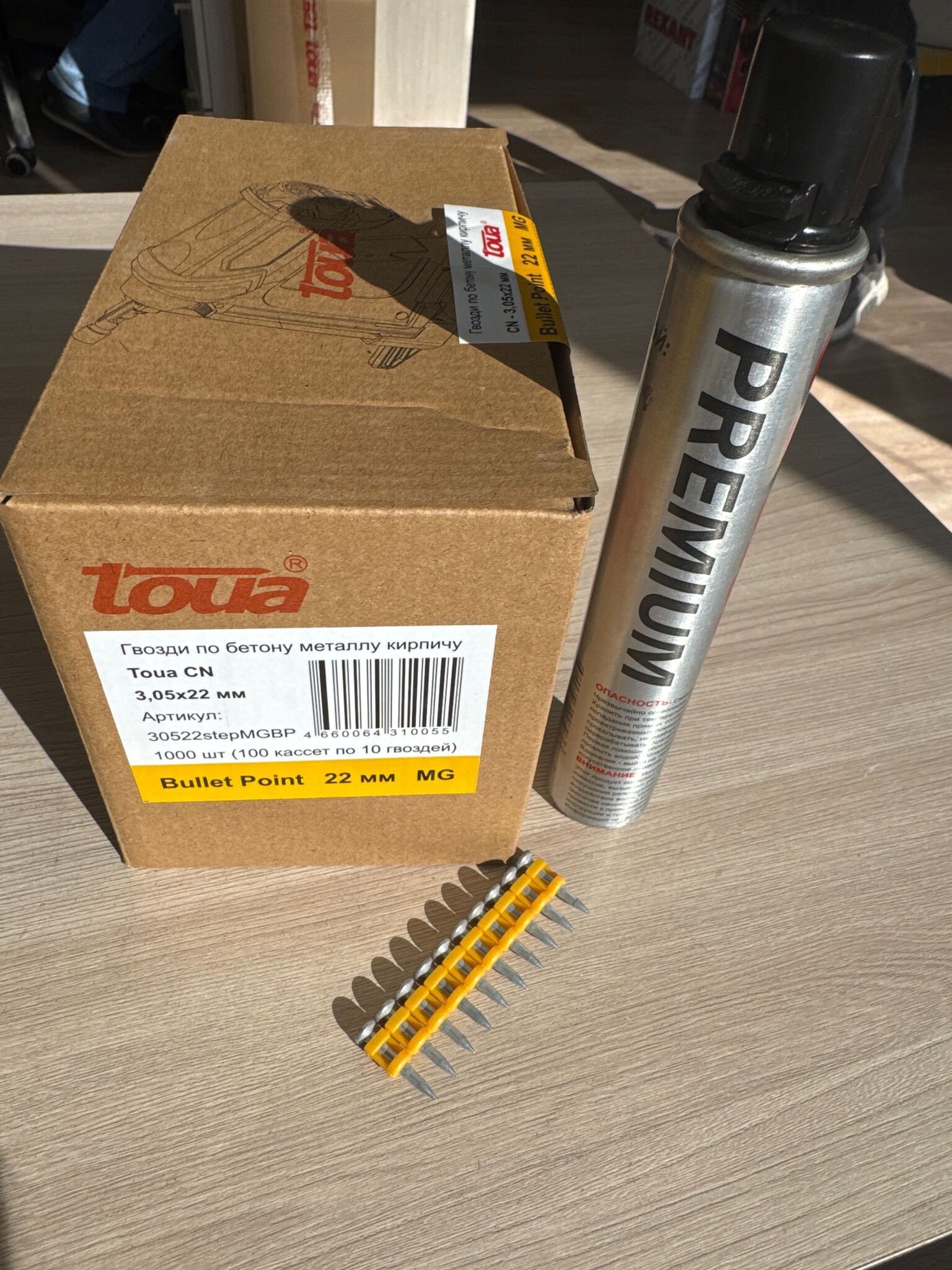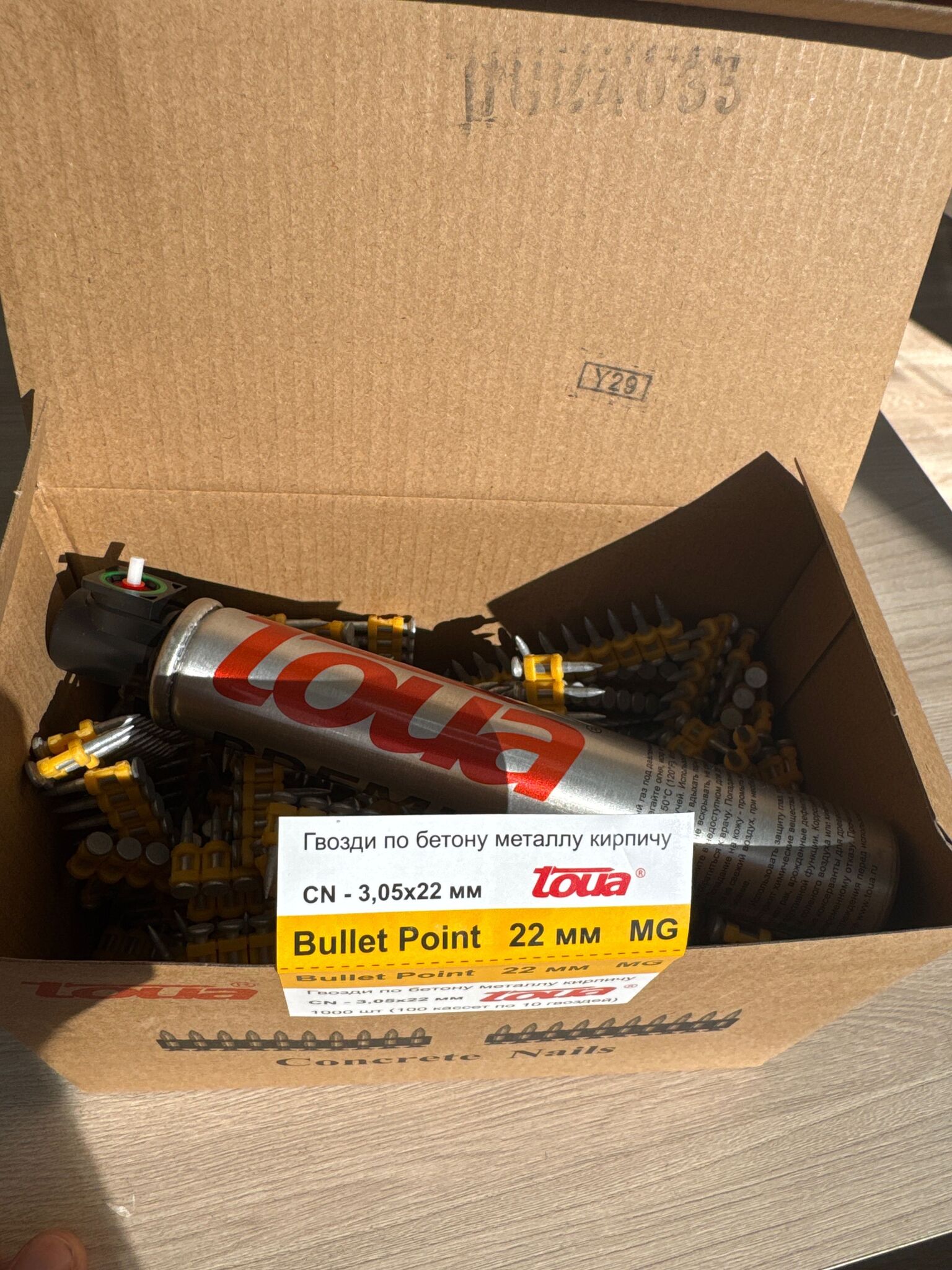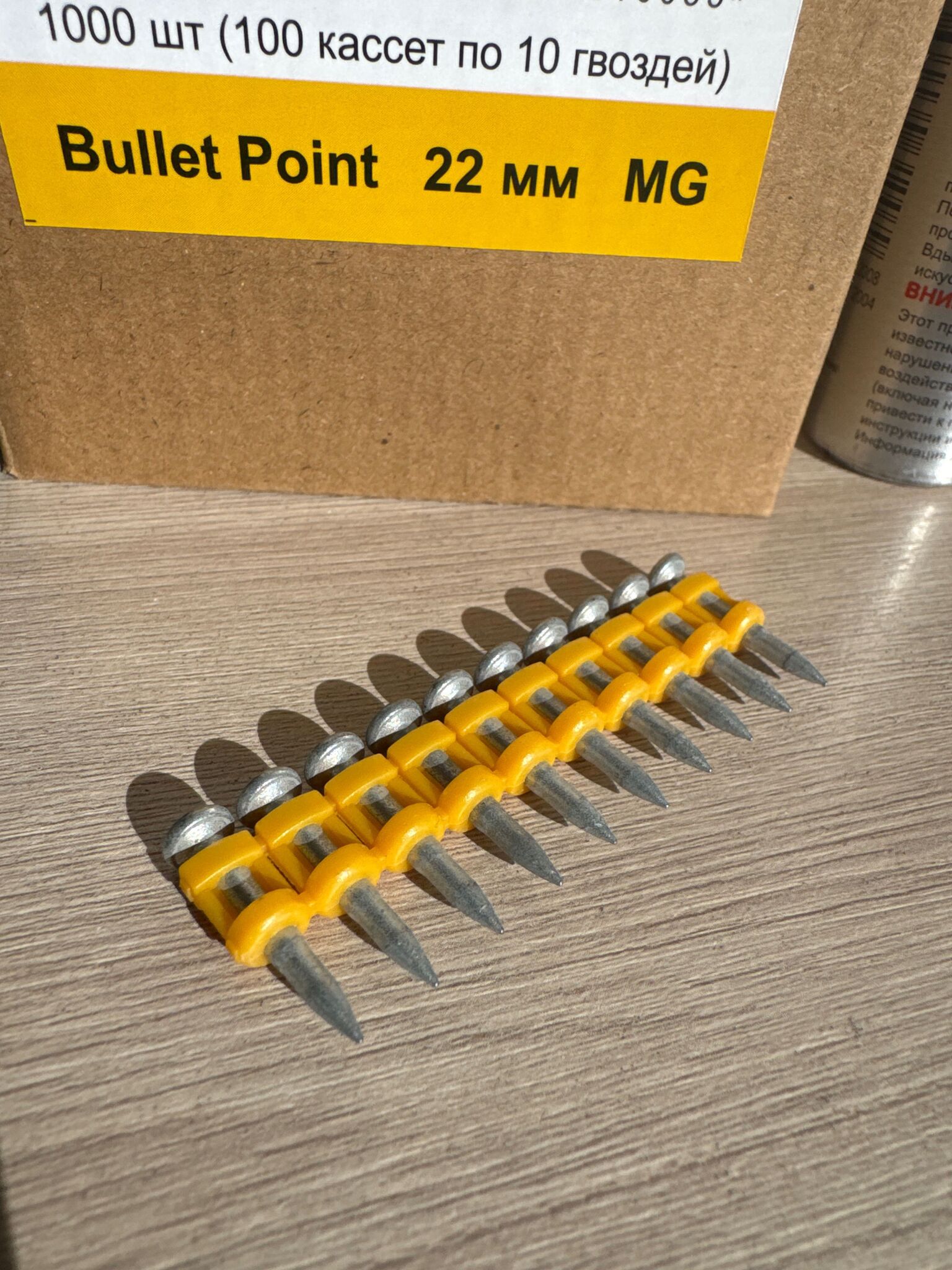 Гвозди и баллон 22 мм предназначены для надежного крепления различных материалов, таких как бетон, металл и кирпич. В комплекте вы получаете 100 кассет по 10 штук гвоздей, что обеспечивает вам достаточное количество гвоздей для выполнения различных задач.