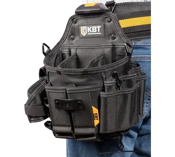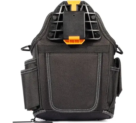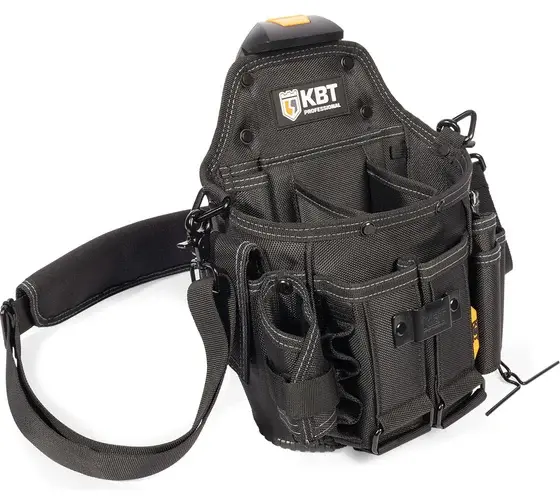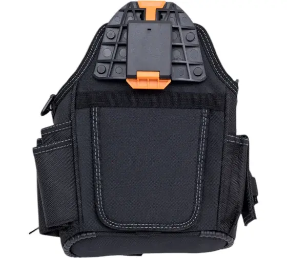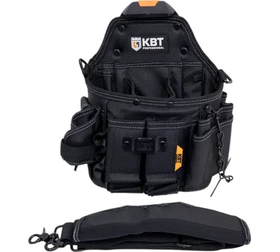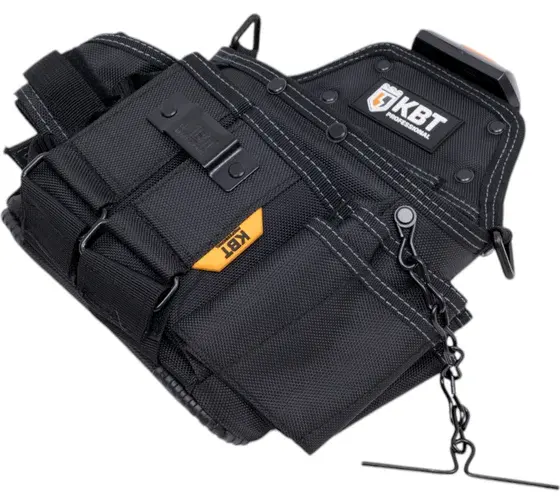 - Конструкция: 1 основное отделение с 3 секциями 1 карманом и 1 крепежными элементами, 2 фронтальных кармана, 1 кобура для подвешивания, 1 металлический держатель для изоленты, 1 металлический держатель для рулетки