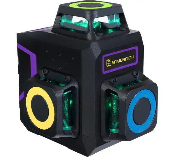 Уровень формирует 12 зеленых линий в трех проекциях, угол развертки составляет 360 градусов как в горизонтальной, так и в обеих вертикальных плоскостях. Благодаря этому можно эффективно выполнять разметку, выравнивание поверхностей и другие операции, требующие высокой точности.