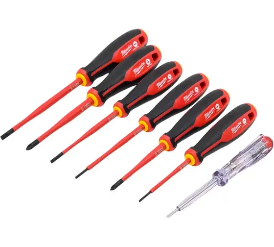 Набор трехгранных отверток Milwaukee VDE SL/PH + тестер напряжения - 7 ед. 4932478739 позволяет работать практически с любой электроникой. Удобные рукоятки не скользят и не проворачиваются. Это позволяет эффективно вращать тугой крепеж.