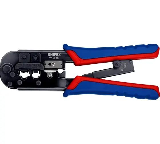 Пресс-клещи для штекеров KNIPEX RJ (Western), 2 гнезда, RJ 11/12, RJ 45, 190 мм, KN-975110SB - профессиональный инструмент для резания и удаления оболочки с плоских, неэкранированных телефонных кабелей, а также для опрессовки 6- и 8-полюсных штекеров Western типа RJ 11/12 (ширина 9,65 мм) и типа RJ 45 (ширина 11,68 мм).