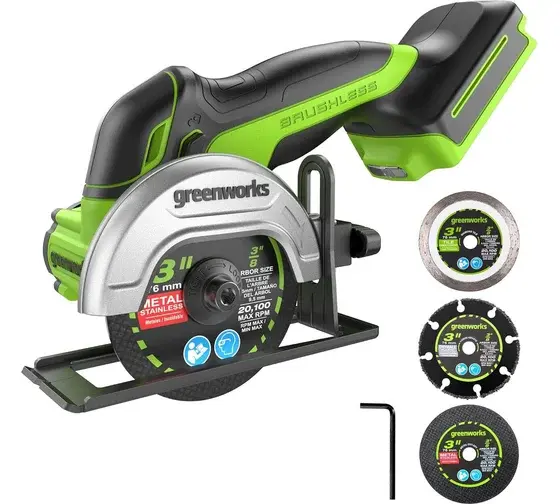 Замена оснастки без ключа невозможна. Кожух можно регулировать без инструмента. Виброручка не предусмотрена. Функция плавного пуска есть. В комплекте идет 3 диска.